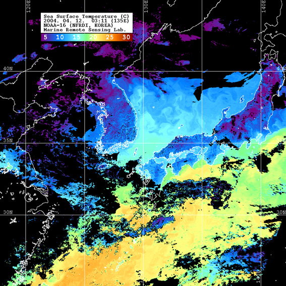 o 2004년 04월 12일 03시 11분 NOAA-16호 위성영상입니다. o 수온분포는 범례를 참고하시기 바랍니다. o 검은색은 구름과 육지를 나타냅니다.