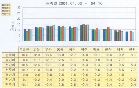 o 최근(2004.04.03∼04.10)의 한반도 연안 표면수온은 동해 연안역에서 섭씨 10.5∼12.5도, 남해 연안역에서 12.5∼14도, 서해 연안역에서 8∼10.5도 내외로 나타납니다.