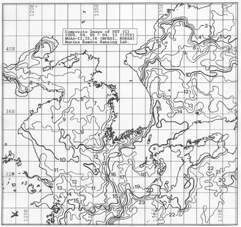 o 대화퇴 근해 7∼9도, 울릉도 근해 11∼12, 대마도 근해 15∼16도, 제주도 근해 14∼16도, 이어도 근해 10∼11도, 일향초 근해 8∼9도, 어청도 근해 7∼8도 내외로 나타납니다.