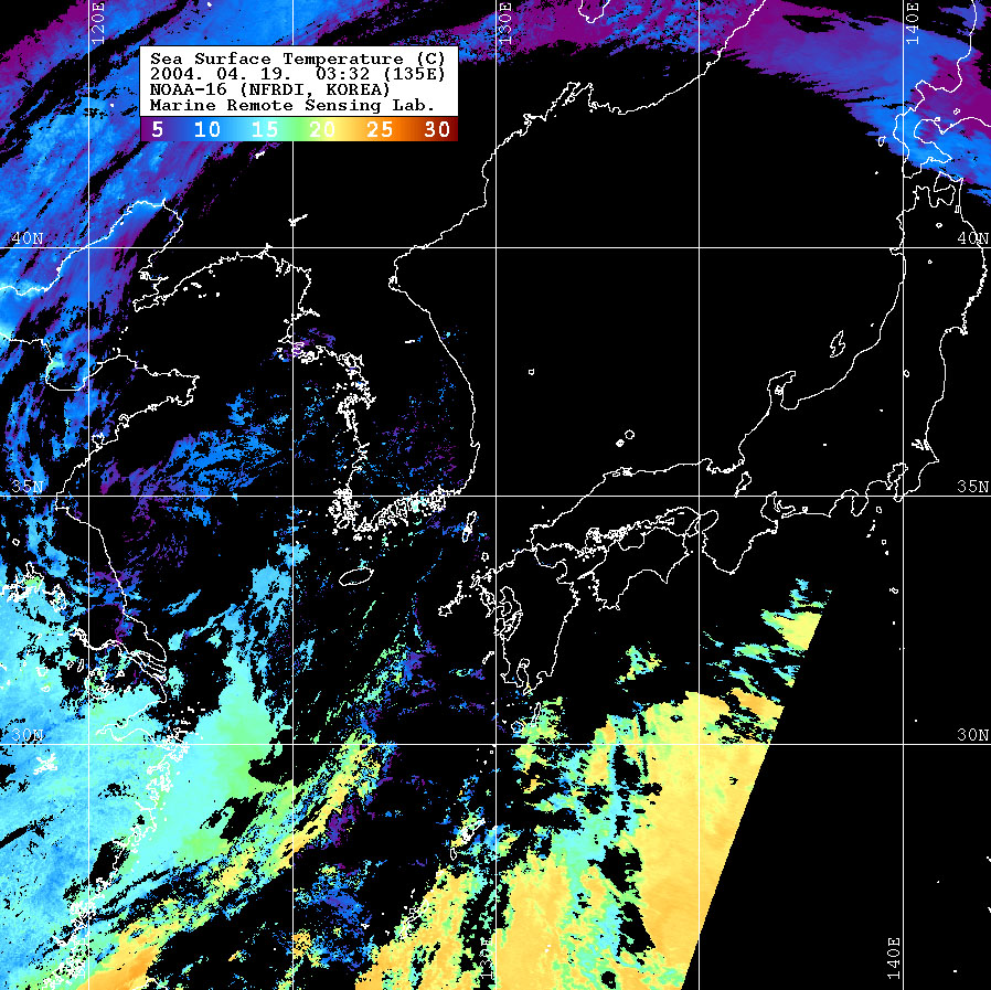 o 2004년 04월 19일 03시 32분 NOAA-16호 위성영상입니다. o 수온분포는 범례를 참고하시기 바랍니다. o 검은색은 구름과 육지를 나타냅니다.