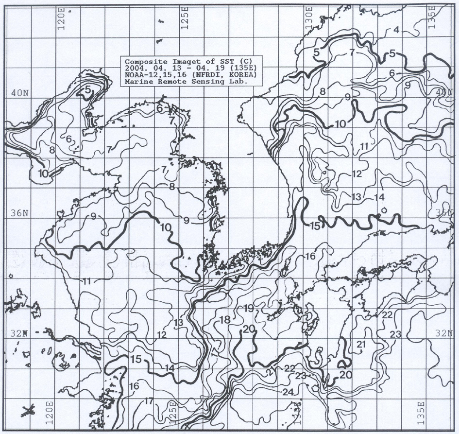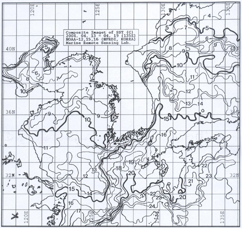 o 대화퇴 근해 8∼9도, 울릉도 근해 12∼13, 대마도 근해 15∼17도, 제주도 근해 15∼17도, 이어도 근해 12∼13도, 일향초 근해 10∼11도, 어청도 근해 7∼8도 내외로 예상됩니다. o「평년에 비해」수온은 대화퇴 근해 0.5도 높게, 울릉도 근해 1.5도 높게, 대마도 근해 1도 높게, 제주도 근해 1.5도 높게, 이어도 근해 2도 높게, 일향초 및 어청도 근해 0.5도 높게 나타날 것으로 예상됩니다. o 수온전선대는 수온 14도를 중심으로 이어도 동쪽 90km 외해와 거문도∼거제도를 잇는 해역에서 형성될 것으로 예상됩니다. < 위의 그림을 클릭하시면 확대된 수온정보를 보실 수 있습니다 >