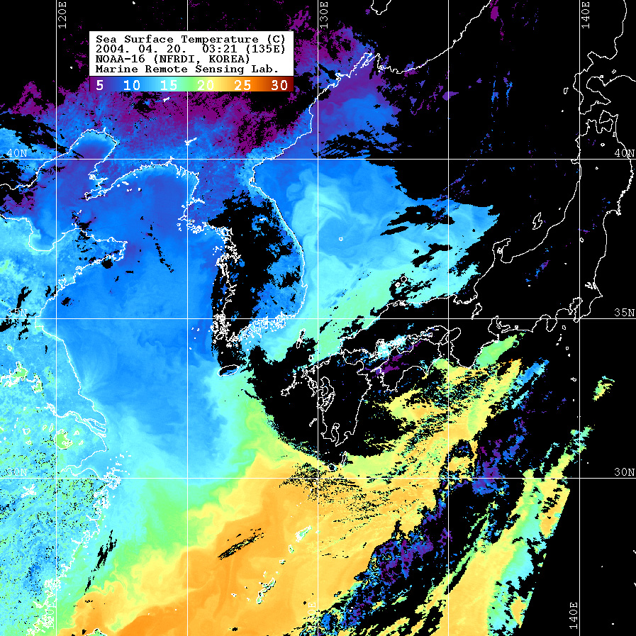 o 2004년 04월 20일 03시 21분 NOAA-16호 위성영상입니다. o 수온분포는 범례를 참고하시기 바랍니다. o 검은색은 구름과 육지를 나타냅니다.