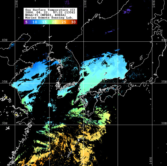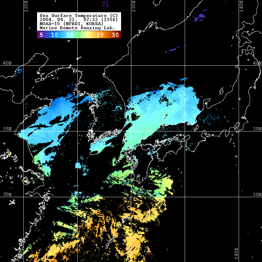 o 2004년 04월 22일 07시 22분 NOAA-15호 위성영상입니다. o 수온분포는 범례를 참고하시기 바랍니다. o 검은색은 구름과 육지를 나타냅니다.