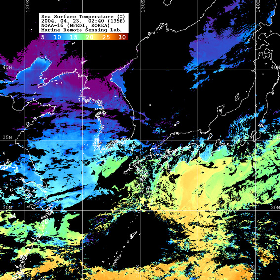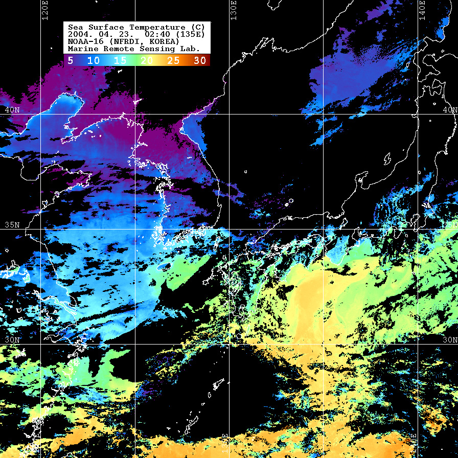 o 2004년 04월 23일 02시 40분 NOAA-16호 위성영상입니다. o 수온분포는 범례를 참고하시기 바랍니다. o 검은색은 구름과 육지를 나타냅니다.