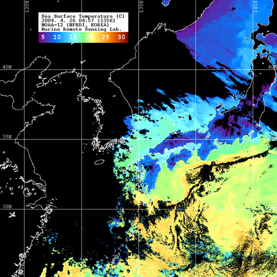 o 2004년 04월 26일 04시 57분 NOAA-12호 위성영상입니다. o 수온분포는 범례를 참고하시기 바랍니다. o 검은색은 구름과 육지를 나타냅니다.