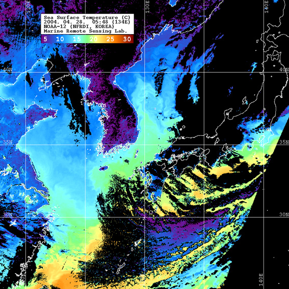 o 2004년 04월 28일 05시 48분 NOAA-12호 위성영상입니다. o 수온분포는 범례를 참고하시기 바랍니다. o 검은색은 구름과 육지를 나타냅니다.
