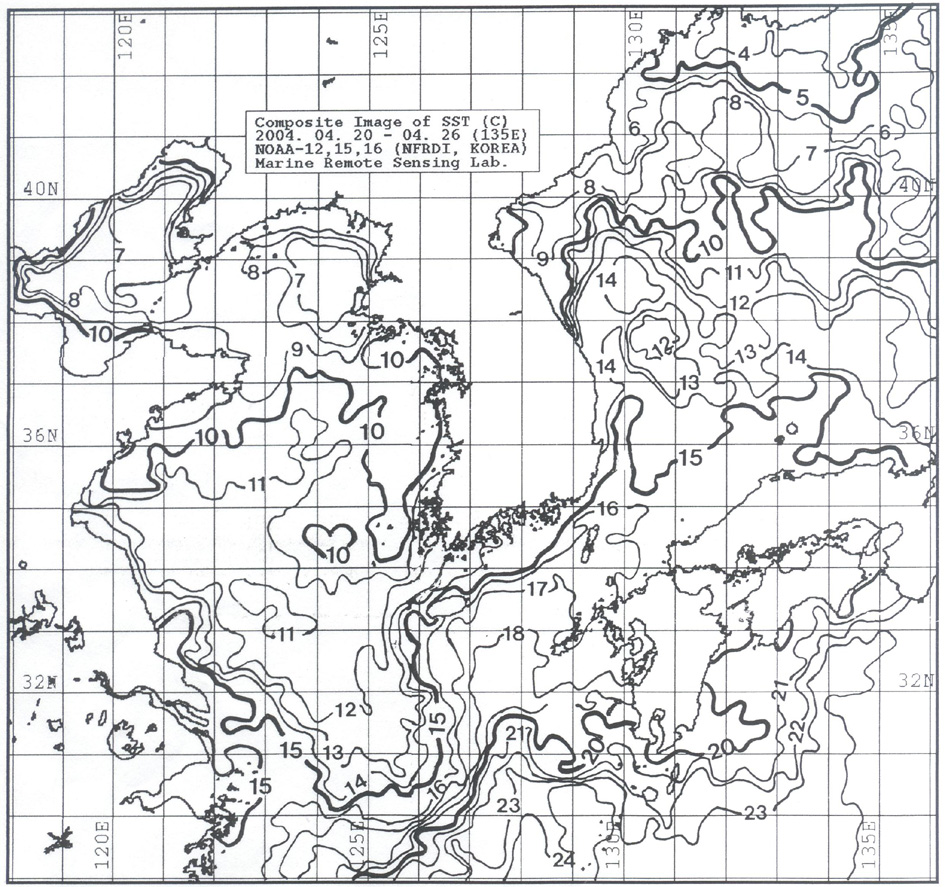 o 대화퇴 근해 8∼10도, 울릉도 근해 12∼13, 대마도 근해 16∼17도, 제주도 근해 15∼17도, 이어도 근해 12∼13도, 일향초 근해 10∼11도, 어청도 근해 9∼10도 내외로 나타납니다. o「평년에 비해」수온은 대화퇴 근해 비슷하게, 울릉도 근해 0.5도 낮게, 대마도 근해 1도 높게, 제주도 근해 및 이어도 근해 0.5도 높게, 일향초 근해 비슷하게, 어청도 근해 1도 높게 나타납니다. o 수온전선대는 수온 15도를 중심으로 이어도 동쪽 130km 외해와 거문도∼거제도를 잇는 해역에서 형성됩니다. < 위의 그림을 클릭하시면 확대된 수온정보를 보실 수 있습니다 >