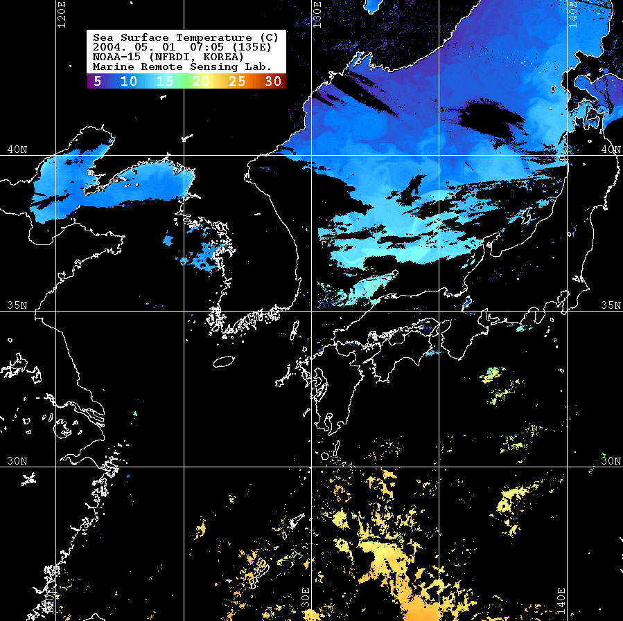 o 2004년 05월 01일 07시 05분 NOAA-15호 위성영상입니다. o 수온분포는 범례를 참고하시기 바랍니다. o 검은색은 구름과 육지를 나타냅니다.