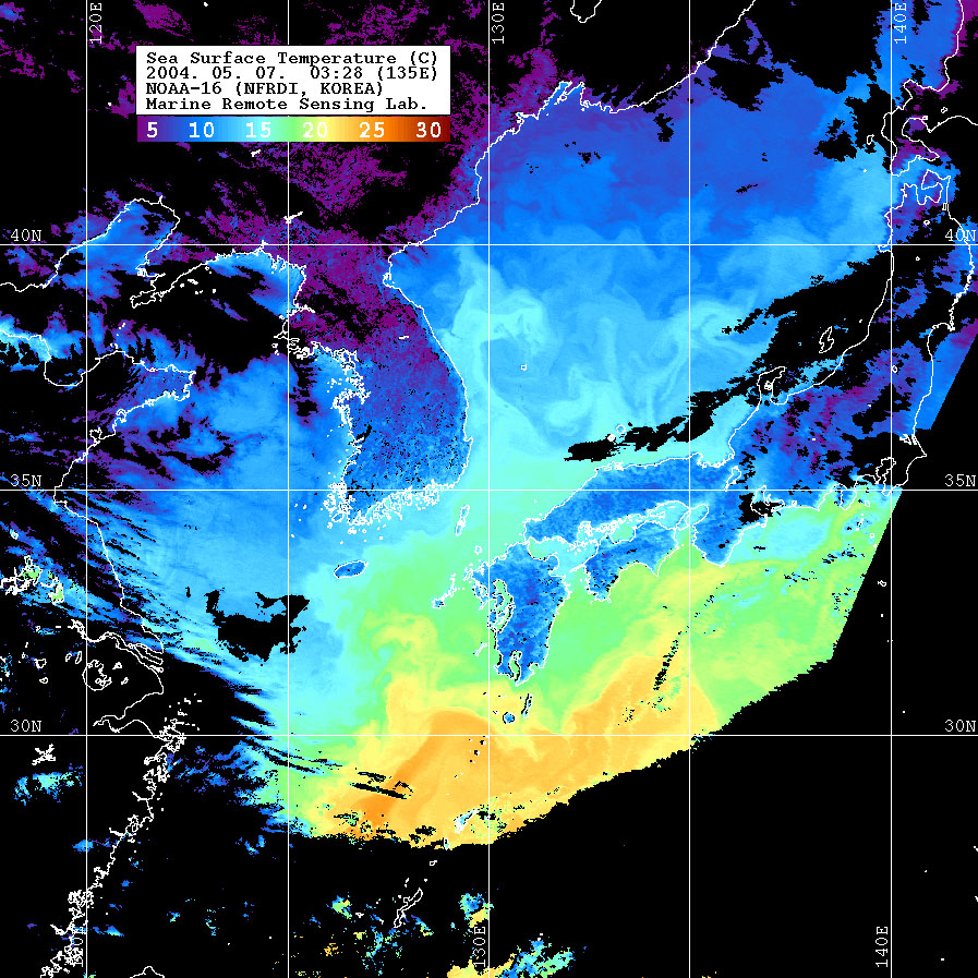 o 2004년 05월 07일 03시 28분 NOAA-16호 위성영상입니다. o 수온분포는 범례를 참고하시기 바랍니다. o 검은색은 구름과 육지를 나타냅니다.