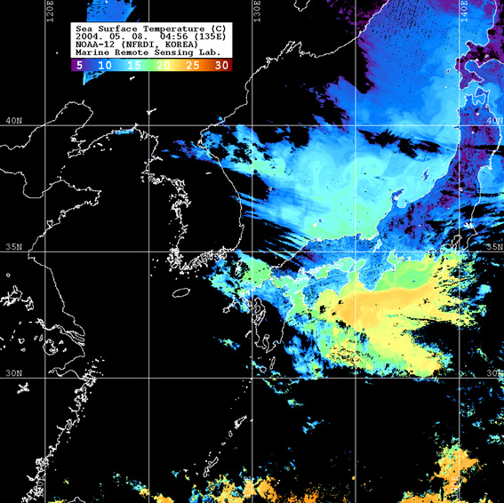 o 2004년 05월 08일 04시 56분 NOAA-12호 위성영상입니다. o 수온분포는 범례를 참고하시기 바랍니다. o 검은색은 구름과 육지를 나타냅니다.