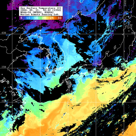 o 2004년 05월 11일 02시 42분 NOAA-16호 위성영상입니다. o 수온분포는 범례를 참고하시기 바랍니다. o 검은색은 구름과 육지를 나타냅니다.
