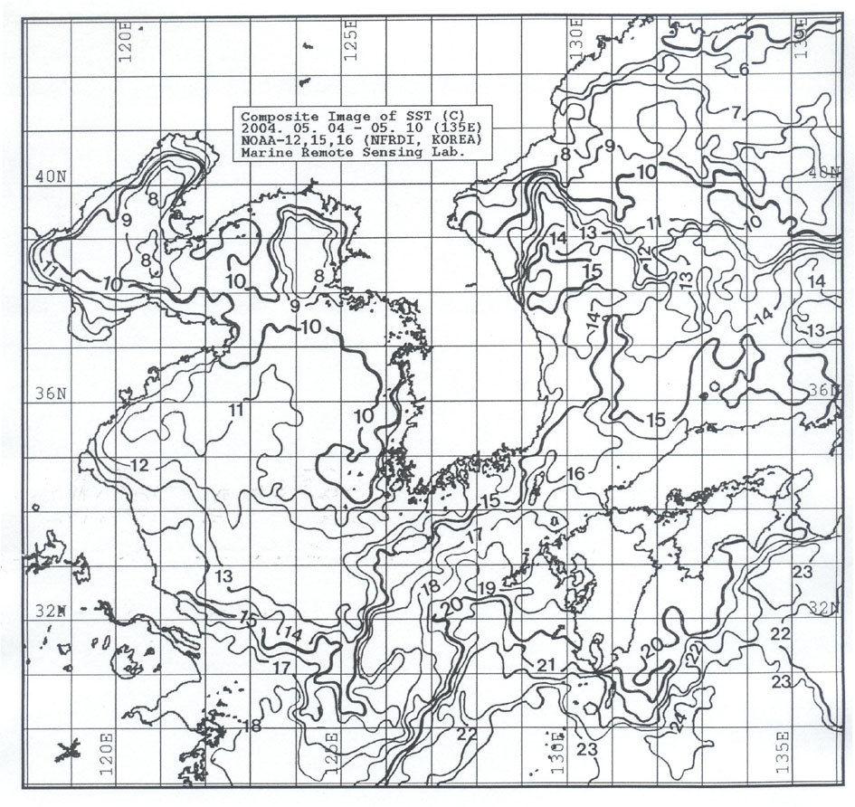 o 대화퇴 근해 9∼10도, 울릉도 근해 14∼15도, 대마도 근해 16∼17도, 제주도 근해 14∼16도, 이어도 근해 13∼14도, 일향초 근해 10∼11도, 어청도 근해 9∼10도 내외로 나타납니다. o 「평년에 비해」수온은 대화퇴 근해 1.5도 낮게, 울릉도 근해 1도 높게, 대마도 근해 비슷하게, 제주도 근해 0.5도 낮게, 이어도 근해 1도 낮게, 일향초 근해 1.5도 낮게, 어청도 근해 0.5도 낮게 나타납니다. o 수온전선대는 수온 14도를 중심으로 이어도 동쪽 50km 외해와 거문도를 잇는 해역에서 형성될 것으로 나타납니다. < 위의 그림을 클릭하시면 확대된 수온정보를 보실 수 있습니다 >