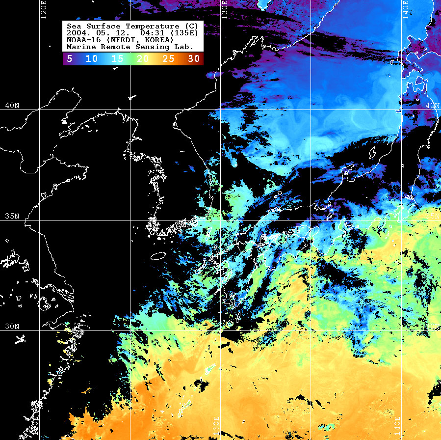 o 2004년 05월 12일 04시 31분 NOAA-16호 위성영상입니다. o 수온분포는 범례를 참고하시기 바랍니다. o 검은색은 구름과 육지를 나타냅니다.