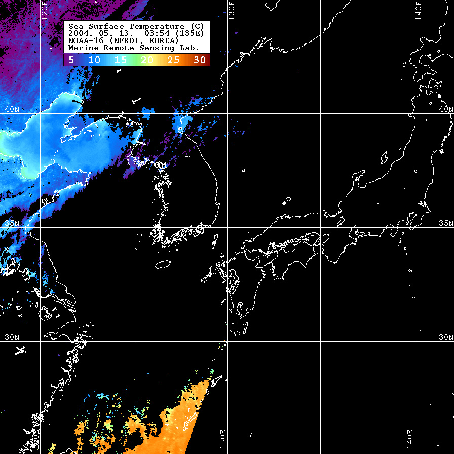 o 2004년 05월 13일 03시 54분 NOAA-16호 위성영상입니다. o 수온분포는 범례를 참고하시기 바랍니다. o 검은색은 구름과 육지를 나타냅니다.
