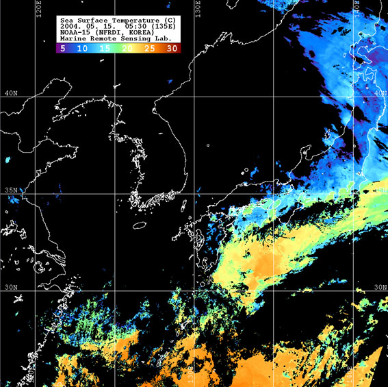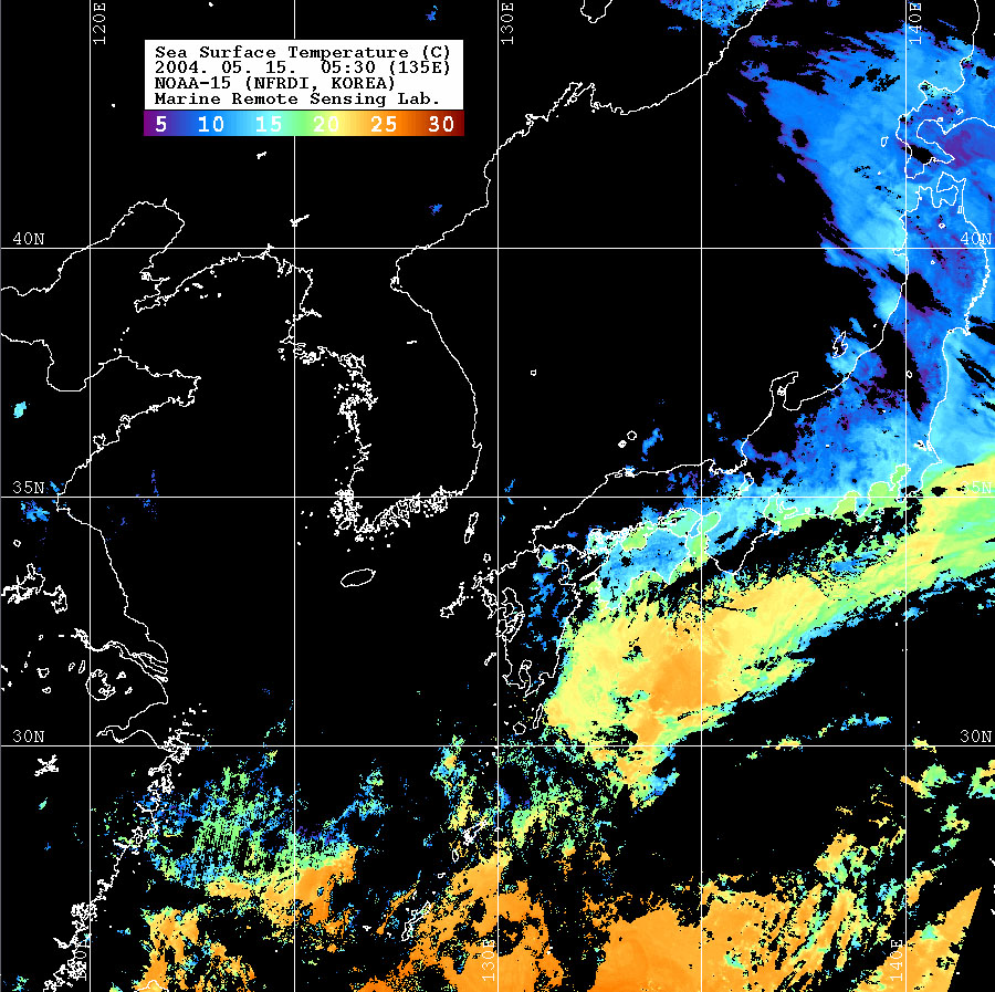 o 2004년 05월 15일 05시 30분 NOAA-15호 위성영상입니다. o 수온분포는 범례를 참고하시기 바랍니다. o 검은색은 구름과 육지를 나타냅니다.