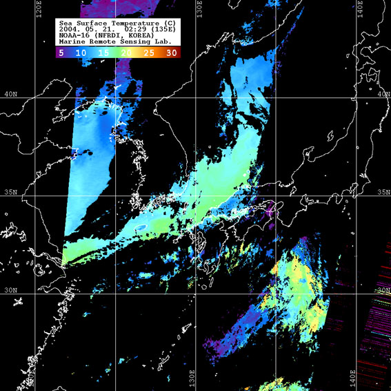 o 2004년 05월 21일 02시 29분 NOAA-16호 위성영상입니다. o 수온분포는 범례를 참고하시기 바랍니다. o 검은색은 구름과 육지를 나타냅니다.