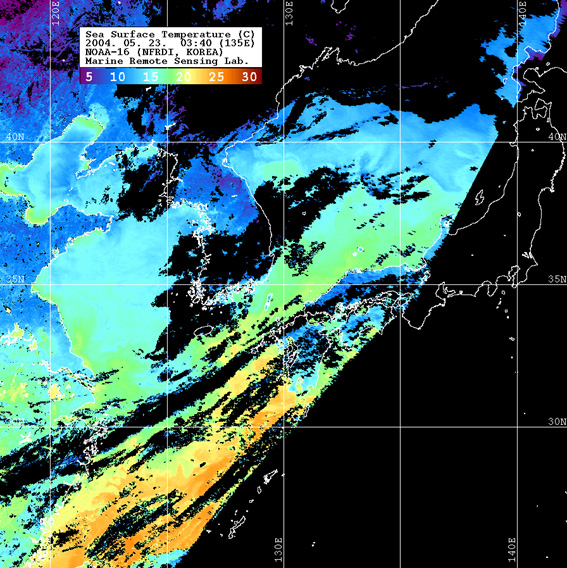 o 2004년 05월 23일 03시 40분 NOAA-16호 위성영상입니다. o 수온분포는 범례를 참고하시기 바랍니다. o 검은색은 구름과 육지를 나타냅니다.