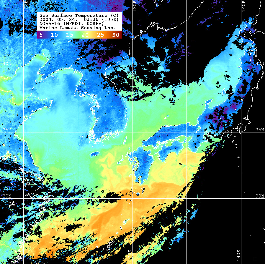 o 2004년 05월 24일 03시 36분 NOAA-16호 위성영상입니다. o 수온분포는 범례를 참고하시기 바랍니다. o 검은색은 구름과 육지를 나타냅니다.
