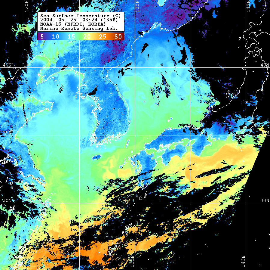 o 2004년 05월 25일 03시 24분 NOAA-16호 위성영상입니다. o 수온분포는 범례를 참고하시기 바랍니다. o 검은색은 구름과 육지를 나타냅니다.
