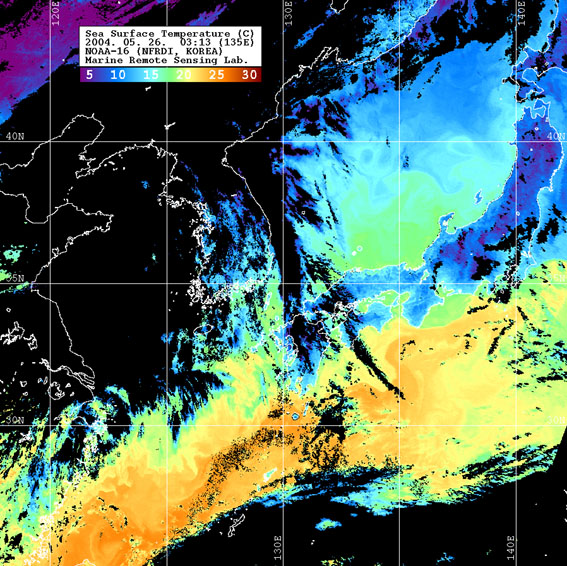 o 2004년 05월 26일 03시 13분 NOAA-16호 위성영상입니다. o 수온분포는 범례를 참고하시기 바랍니다. o 검은색은 구름과 육지를 나타냅니다.