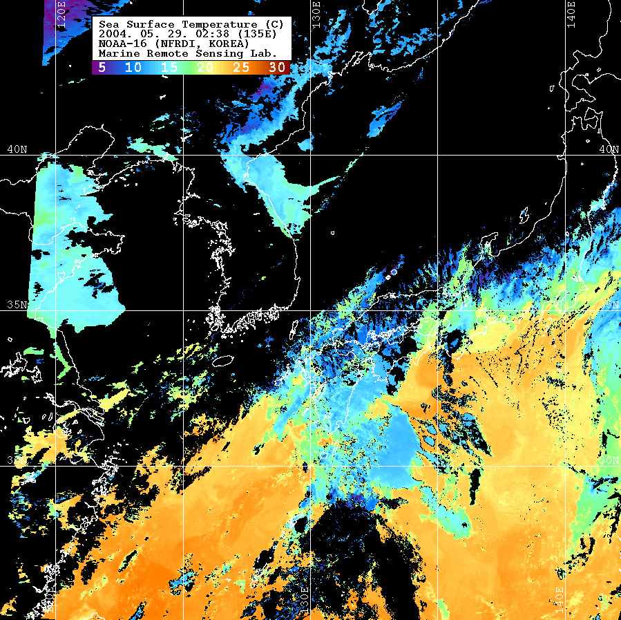 o 2004년 05월 29일 02시 38분 NOAA-16호 위성영상입니다. o 수온분포는 범례를 참고하시기 바랍니다. o 검은색은 구름과 육지를 나타냅니다.