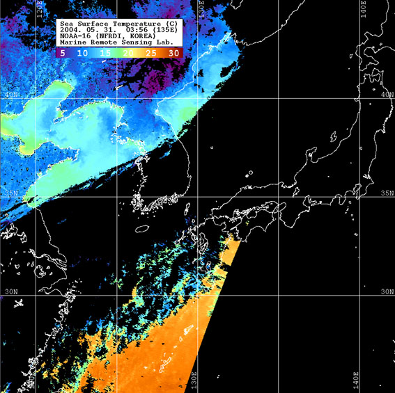 o 2004년 05월 31일 03시 56분 NOAA-16호 위성영상입니다. o 수온분포는 범례를 참고하시기 바랍니다. o 검은색은 구름과 육지를 나타냅니다.