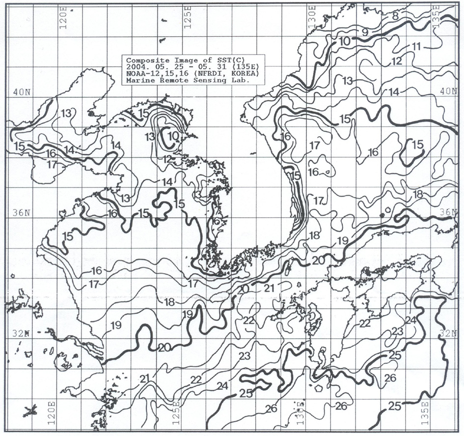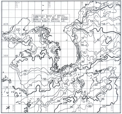 o 아래그림은 NOAA 위성자료를 분석한 한국근해 광역 수온분포도입니다 (2004. 5.25∼5.31). o 한국근해 표면수온은 대화퇴 근해 14∼15도, 울릉도 근해 16∼17도, 대마도 근해 18∼20도, 제주도 근해 18∼20도, 이어도 근해 18∼20도, 일향초 근해 16∼17도, 어청도 근해 14∼15도 내외로 나타납니다. o「평년에 비해」수온은 대화퇴 근해 1도 높게, 울릉도 근해 0.5도 낮게, 대마도 근해 1.5도 높게, 제주도 근해 1도 높게, 이어도 근해 2도 높게, 일향초 근해 1.5도 높게, 어청도 근해 1도 높게 나타납니다. o 수온전선대는 수온 19도를 중심으로 이어도 북부 50km 외해-제주도-대마도간 해역에서 형성될 것으로 나타납니다. < 위의 그림을 클릭하시면 확대된 수온정보를 보실 수 있습니다 >