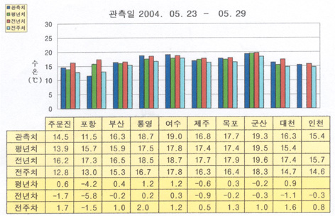 o 금주(2004.05.23∼05.29)의 한반도 연안 표면수온은 동해 연안역에서 섭씨 12∼15도, 남해 연안역에서 17∼19도, 서해 연안역에서 17∼20도 내외로 나타납니다.