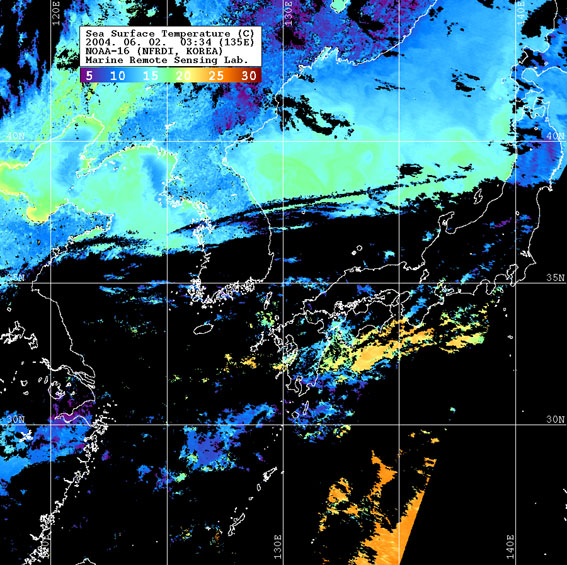 o 2004년 06월 02일 03시 34분 NOAA-16호 위성영상입니다. o 수온분포는 범례를 참고하시기 바랍니다. o 검은색은 구름과 육지를 나타냅니다.