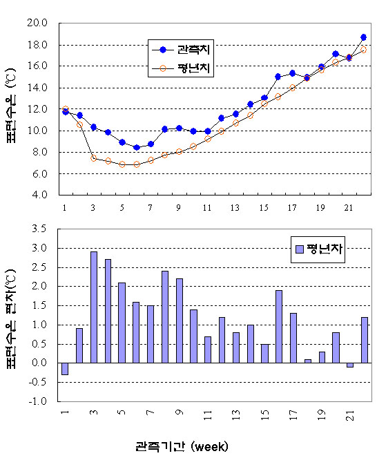 o 첫 주(1월 초순)와 21주(5월 중순)의 일부 기간을 제외한 대부분 기간 동안 통영 연안수온이 평년에 비해 섭씨 0.5∼3도 높게 나타났습니다.
