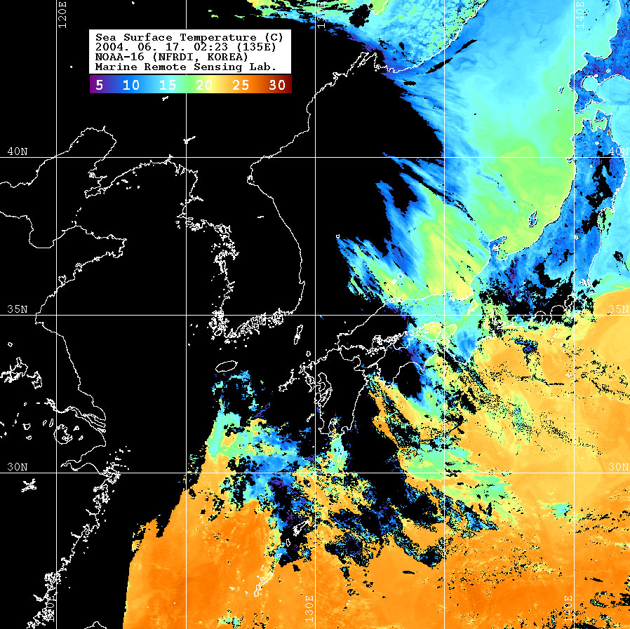 o 2004년 06월 17일 02시 23분 NOAA-16호 위성영상입니다. o 수온분포는 범례를 참고하시기 바랍니다. o 검은색은 구름과 육지를 나타냅니다.