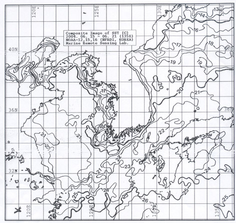 o 금주 (2004.06.15∼06.21)의 한국근해 표면수온은 대화퇴 근해 18∼19도, 울릉도 근해 19∼20도, 대마도 근해 21∼22도, 제주도 근해 20∼22도, 이어도 근해 21∼22도, 일향초 근해 17∼18도, 어청도 근해 16∼18도 내외로 나타납니다.