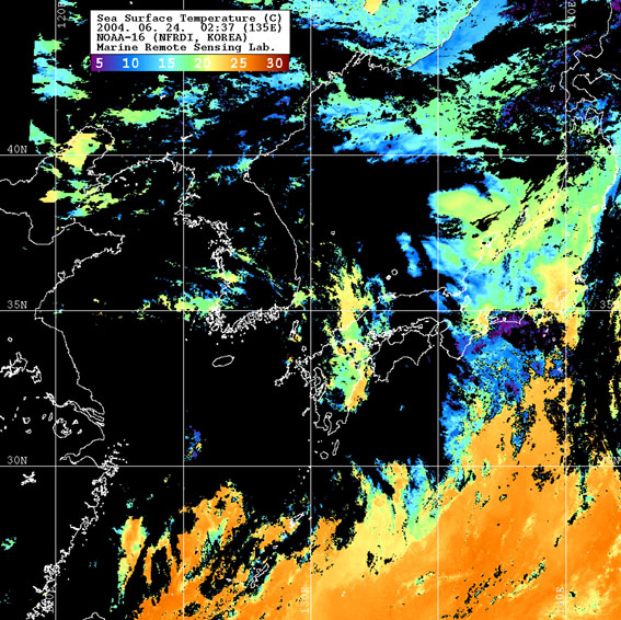 o 2004년 06월 24일 02시 37분 NOAA-16호 위성영상입니다. o 수온분포는 범례를 참고하시기 바랍니다. o 검은색은 구름과 육지를 나타냅니다.