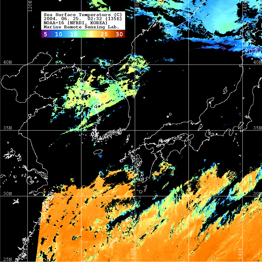 o 2004년 06월 25일 02시 32분 NOAA-16호 위성영상입니다. o 수온분포는 범례를 참고하시기 바랍니다. o 검은색은 구름과 육지를 나타냅니다.