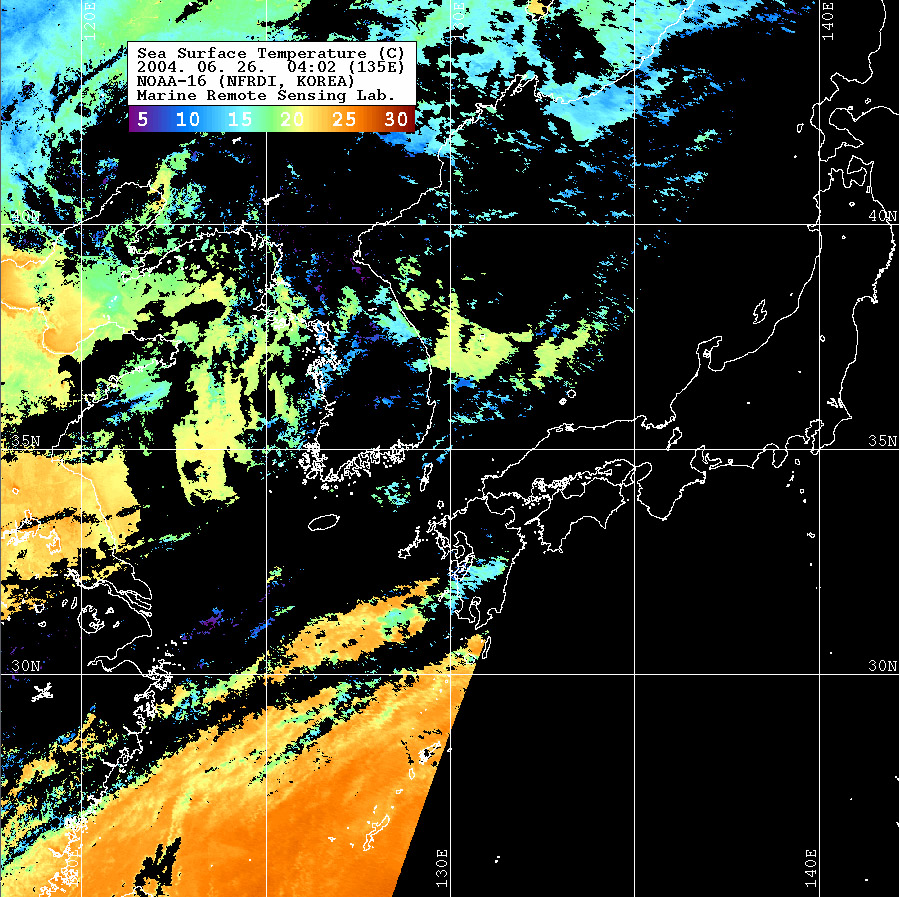 o 2004년 06월 26일 04시 02분 NOAA-16호 위성영상입니다. o 수온분포는 범례를 참고하시기 바랍니다. o 검은색은 구름과 육지를 나타냅니다.