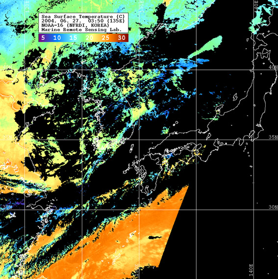 o 2004년 06월 27일 03시 50분 NOAA-16호 위성영상입니다. o 수온분포는 범례를 참고하시기 바랍니다. o 검은색은 구름과 육지를 나타냅니다.