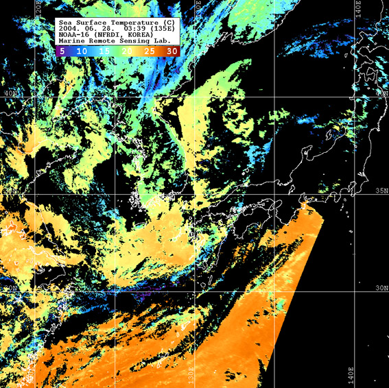 o 2004년 06월 28일 03시 39분 NOAA-16호 위성영상입니다. o 수온분포는 범례를 참고하시기 바랍니다. o 검은색은 구름과 육지를 나타냅니다.