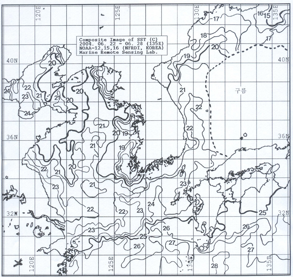 o 금주 (2004.06.22∼06.28)의 한국근해 표면수온은 울릉도 근해 21∼22도, 대마도 근해 22∼24도, 제주도 근해 21∼23도, 이어도 근해 21∼22도, 일향초 근해 19∼21도, 어청도 근해 19∼20도 내외로 나타납니다.