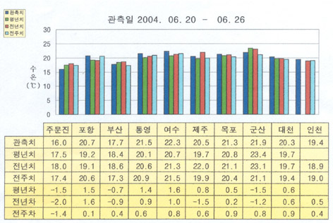 o 금주(2004.06.20∼06.26)의 한반도 연안 표면수온은 동해 연안역에서 섭씨 16∼20.5도, 남해 연안역에서 17.5∼22.5도, 서해 연안역에서 19.5∼22도 내외로 나타납니다.