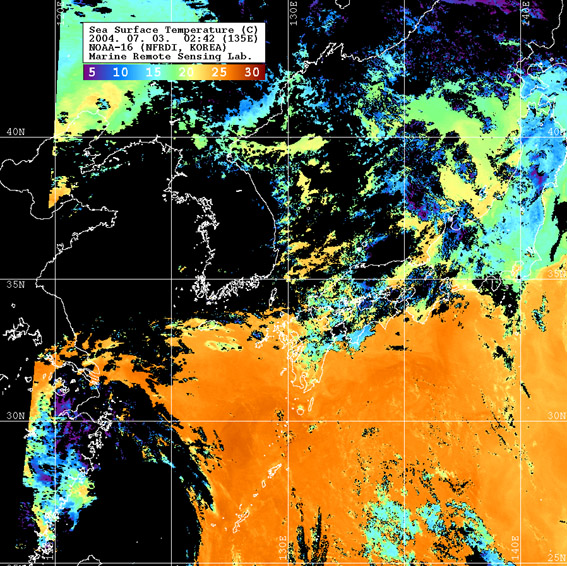 o 2004년 07월 03일 02시 42분 NOAA-16호 위성영상입니다. o 수온분포는 범례를 참고하시기 바랍니다. o 검은색은 구름과 육지를 나타냅니다.