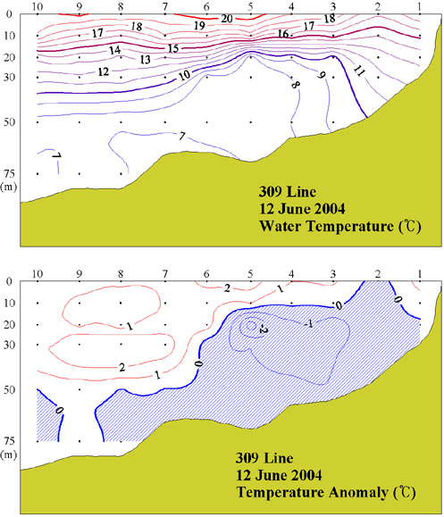 309선(군산서방)의 수직수온분포도 및 평년편차도 입니다.