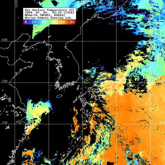 o 2004년 07월 04일 02시 30분 NOAA-16호 위성영상입니다. o 수온분포는 범례를 참고하시기 바랍니다. o 검은색은 구름과 육지를 나타냅니다.