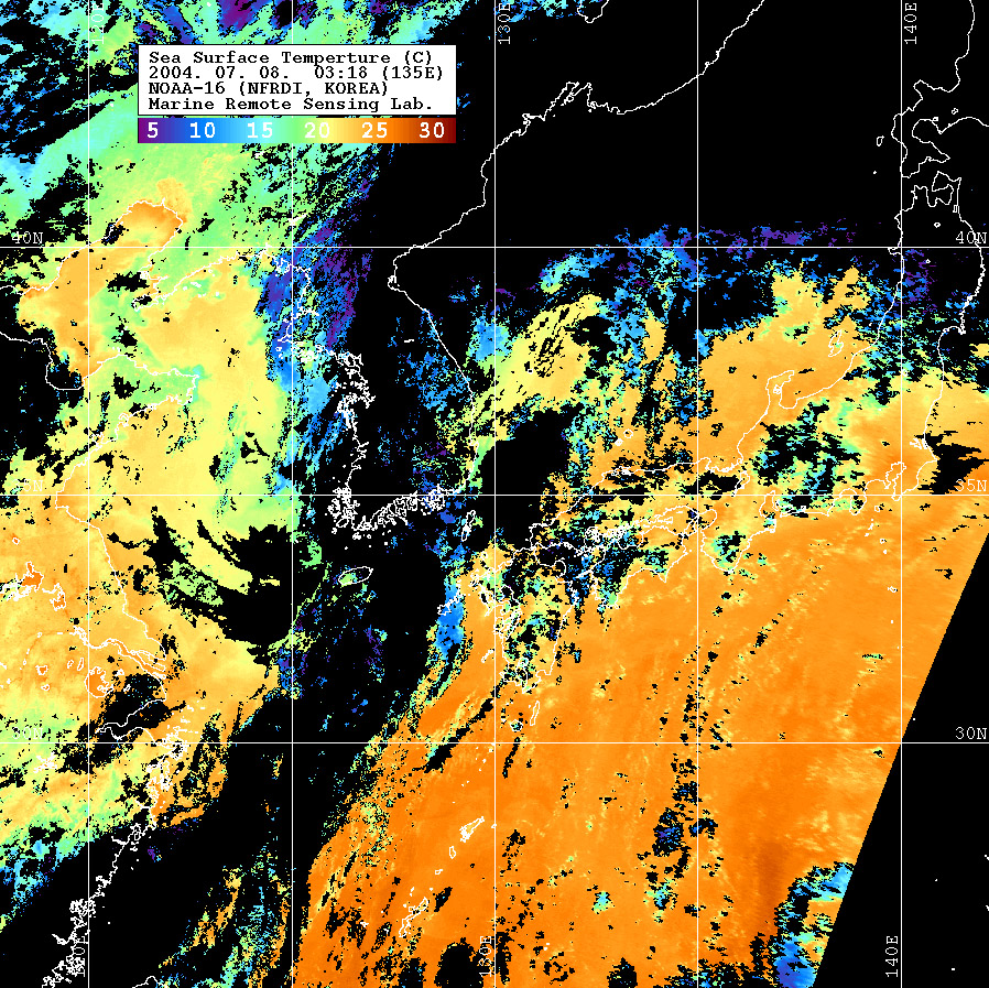 o 2004년 07월 08일 03시 18분 NOAA-16호 위성영상입니다. o 수온분포는 범례를 참고하시기 바랍니다. o 검은색은 구름과 육지를 나타냅니다.