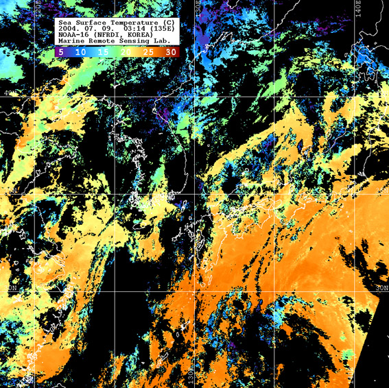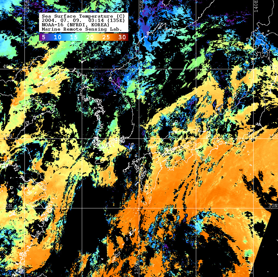 o 2004년 07월 09일 03시 14분 NOAA-16호 위성영상입니다. o 수온분포는 범례를 참고하시기 바랍니다. o 검은색은 구름과 육지를 나타냅니다.