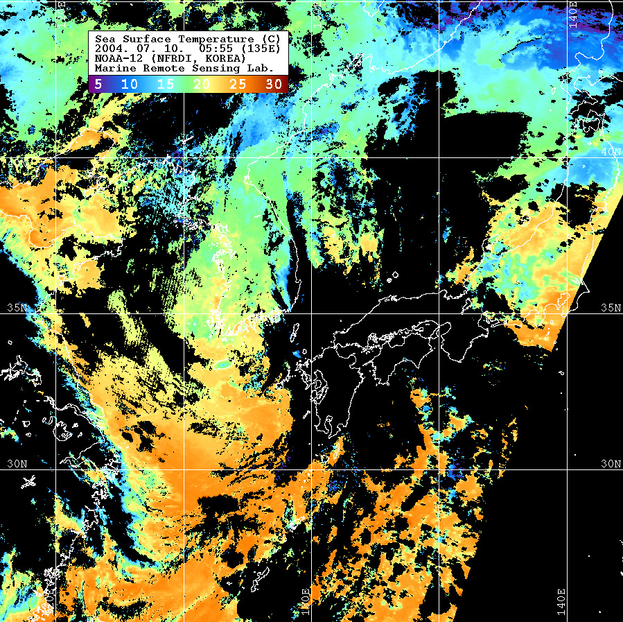 o 2004년 07월 10일 05시 55분 NOAA-12호 위성영상입니다. o 수온분포는 범례를 참고하시기 바랍니다. o 검은색은 구름과 육지를 나타냅니다.