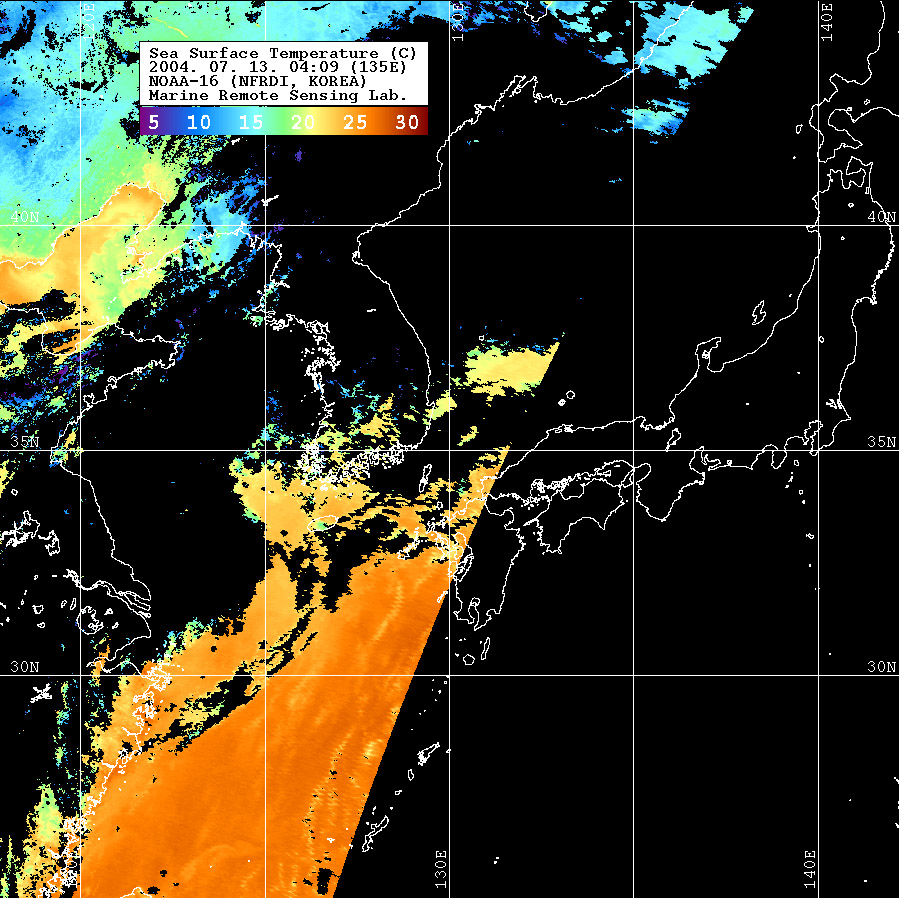 o 2004년 07월 13일 04시 09분 NOAA-16호 위성영상입니다. o 수온분포는 범례를 참고하시기 바랍니다. o 검은색은 구름과 육지를 나타냅니다.