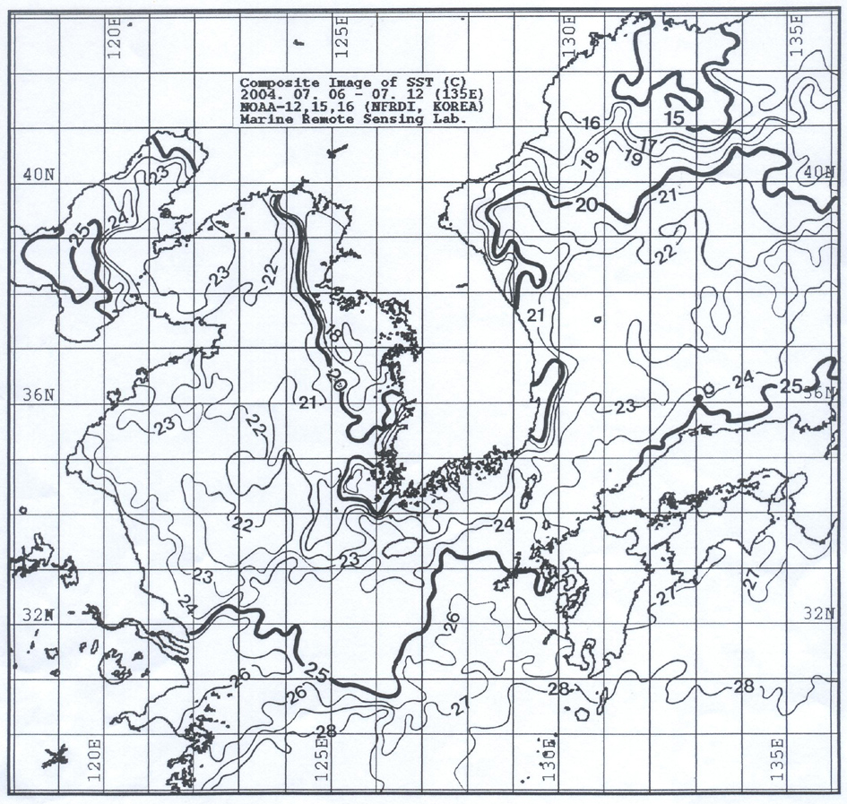 o 금주 (2004.07.06∼07.12)의 한국근해 표면수온은 대화퇴 근해 19∼21도, 울릉도 근해 22∼23도, 대마도 근해 23∼24도, 제주도 근해 23∼24도, 이어도 근해 24∼25도, 일향초 근해 20∼21도, 어청도 근해 19∼20도 내외로 나타납니다.