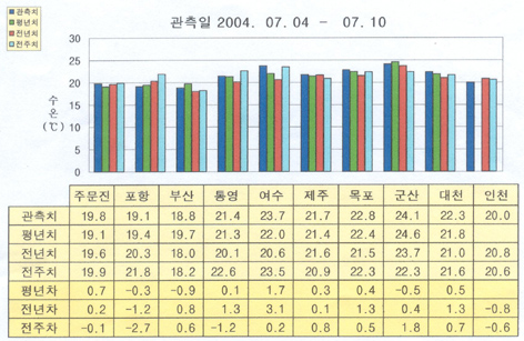o 금주(2004.07.04∼07.10)의 한반도 연안 표면수온은 동해 연안역에서 섭씨 19∼20도, 남해 연안역에서 19∼23.5도, 서해 연안역에서 20∼24도 내외로 나타납니다.