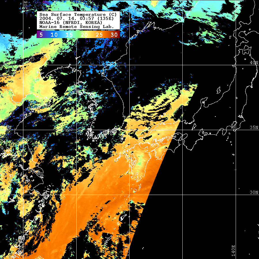 o 2004년 07월 14일 03시 57분 NOAA-16호 위성영상입니다. o 수온분포는 범례를 참고하시기 바랍니다. o 검은색은 구름과 육지를 나타냅니다.