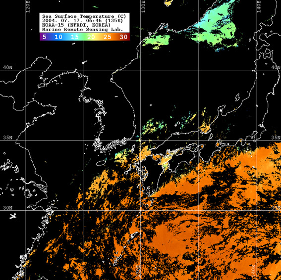 o 2004년 07월 17일 06시 46분 NOAA-15호 위성영상입니다. o 수온분포는 범례를 참고하시기 바랍니다. o 검은색은 구름과 육지를 나타냅니다.